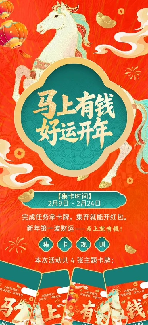 本次活动一共 4张主题卡牌:“马”“上”“有”“钱”,只要在活动期间集齐一整套“马上有钱”,就可以参加红包兑换!