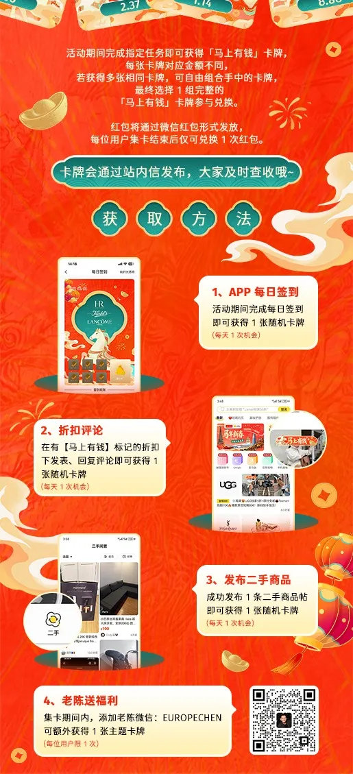 在2月9日-2月24日期间内集齐「马上有钱」完整卡牌,并在2月27日前添加我们的工作人员核实,核实无误后将通过【微信红包】发放新年奖励!