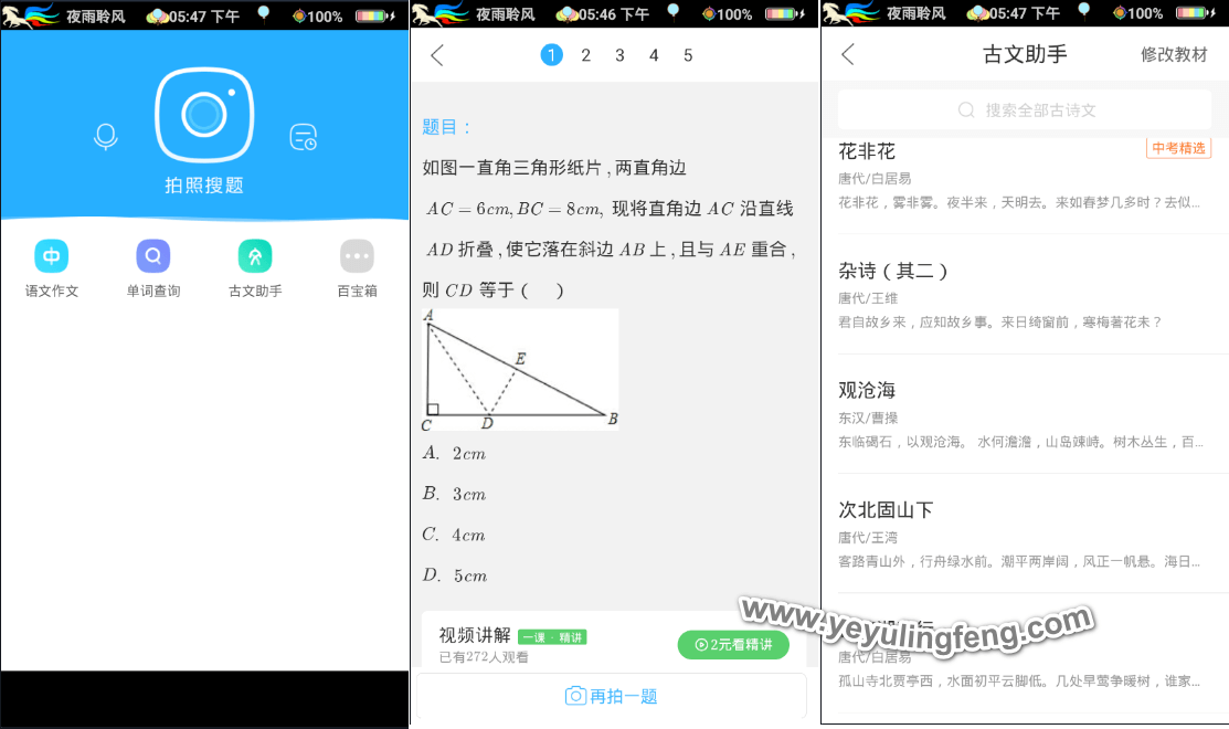 暑期不知不觉就已经过了1/4了,不知道熊孩子们的作业有没有开封过,还是像老夜一样囤到最后几天再请隔壁小姐姐家的狗给咬碎(切勿模仿)。现在不得不羡慕如今的00后了,信息化发达的今天科技已经越来越离不开日常生活,以前是哪里不会点哪里,现在是哪里不会扫哪里,大大减轻了家长的辅导压力。目前搜题软件有很多,功能也特别的全,但是请家长同志们合理监督熊孩子合理使用,否则太过依赖于搜题工具对学习也有影响。本次老夜分享的作业帮就是一款出色的安卓端搜题工具,涵盖了小学、初中、高中所有课程的题库,除了拍题搜题作业帮如今还支持古诗文的查阅以及翻译了,在解决疑难学习问题的同时还能巩固和加强学习内容!
