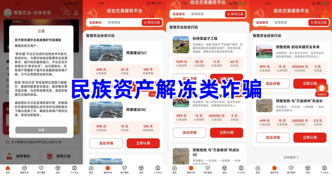 不法分子冒充农业农村部的名义,打着“智慧农业”的旗号,制作散布涉诈APP,虚构推广“两重建设”“扶持菜篮子工程”“万亩绿洲”等高额返利理财项目。
