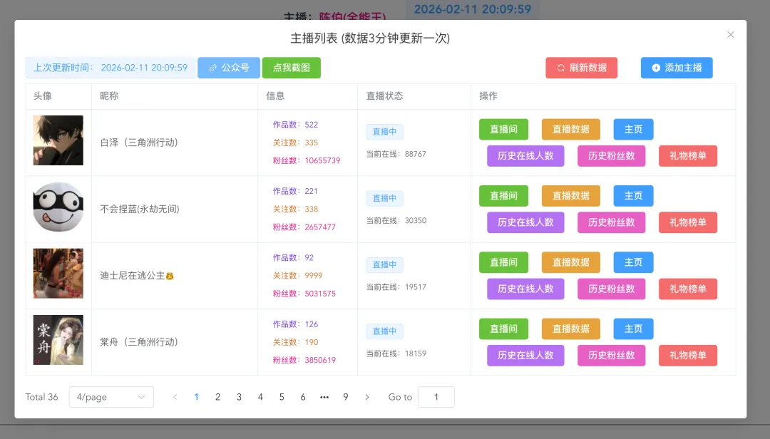 除了基础的实时数据,平台还配备了丰富且实用的功能入口,针对每一位收录的主播,都设置了专属的功能操作栏。不仅能一键跳转进入直播间,实现快速观看,还能点击查看详细的直播数据、主播专属主页,深入了解主播的内容创作与运营情况。