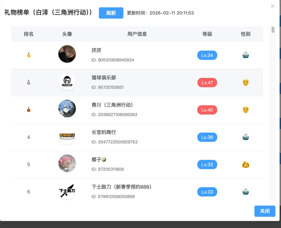 更贴心的是,平台还支持追溯直播间历史在线人数、主播历史粉丝数变化,同时可查看直播间礼物榜单,从实时数据到历史趋势,从人气表现到礼物收益,多维度拆解直播间运营数据,全方位掌握主播与直播间的发展动态。