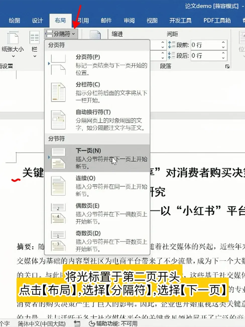 1️⃣ 首先将光标置于第二页开头,点击【布局】,选择【分隔符】,点击【下一页】,这样就分成两节了。