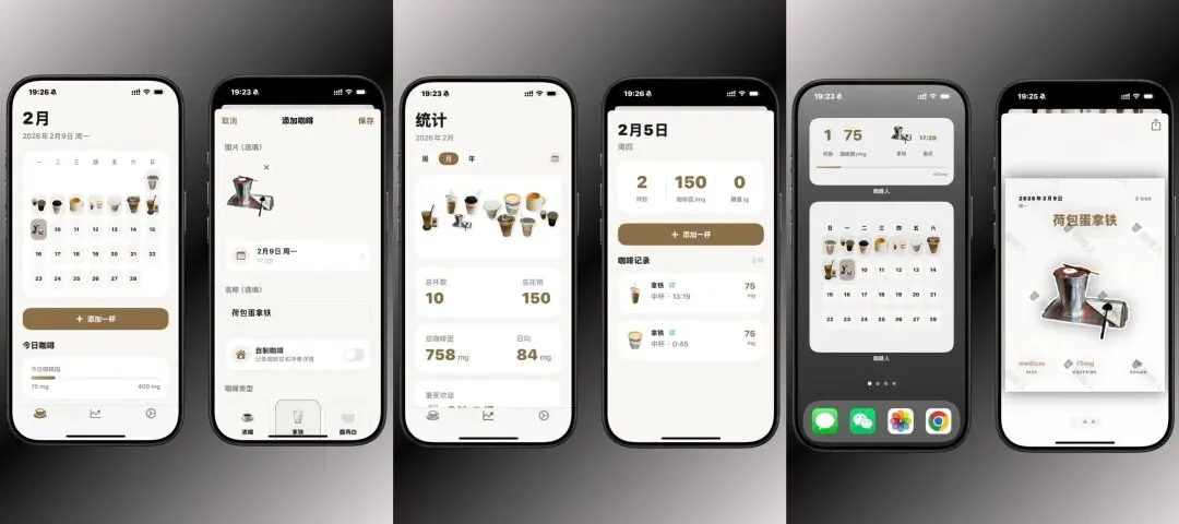 周、月、年咖啡摄入和花销一眼就懂,咖啡卡片还能直接分享。