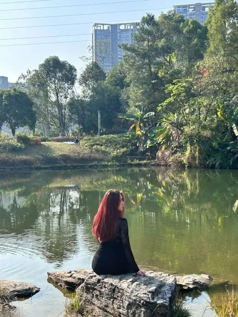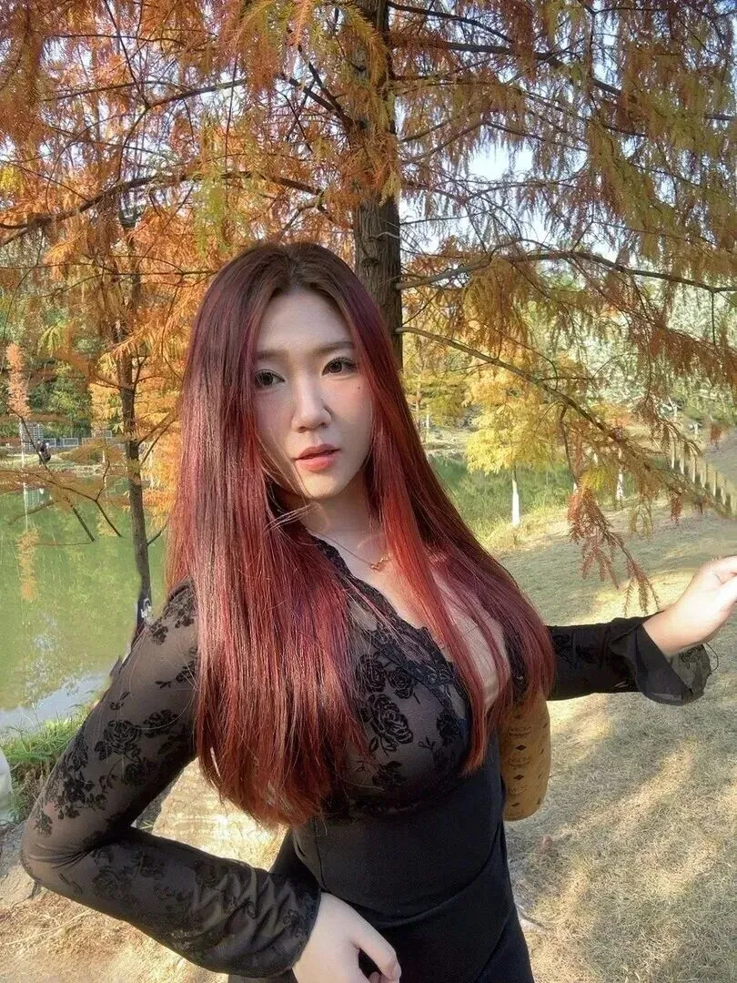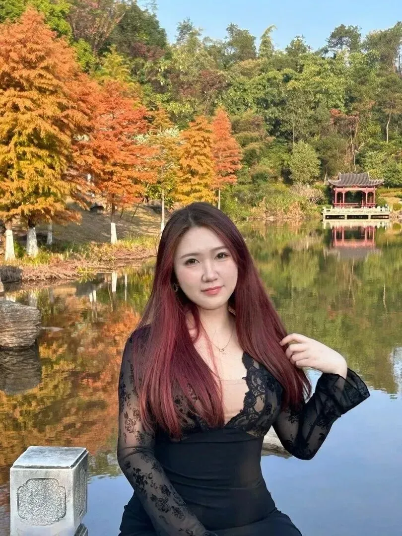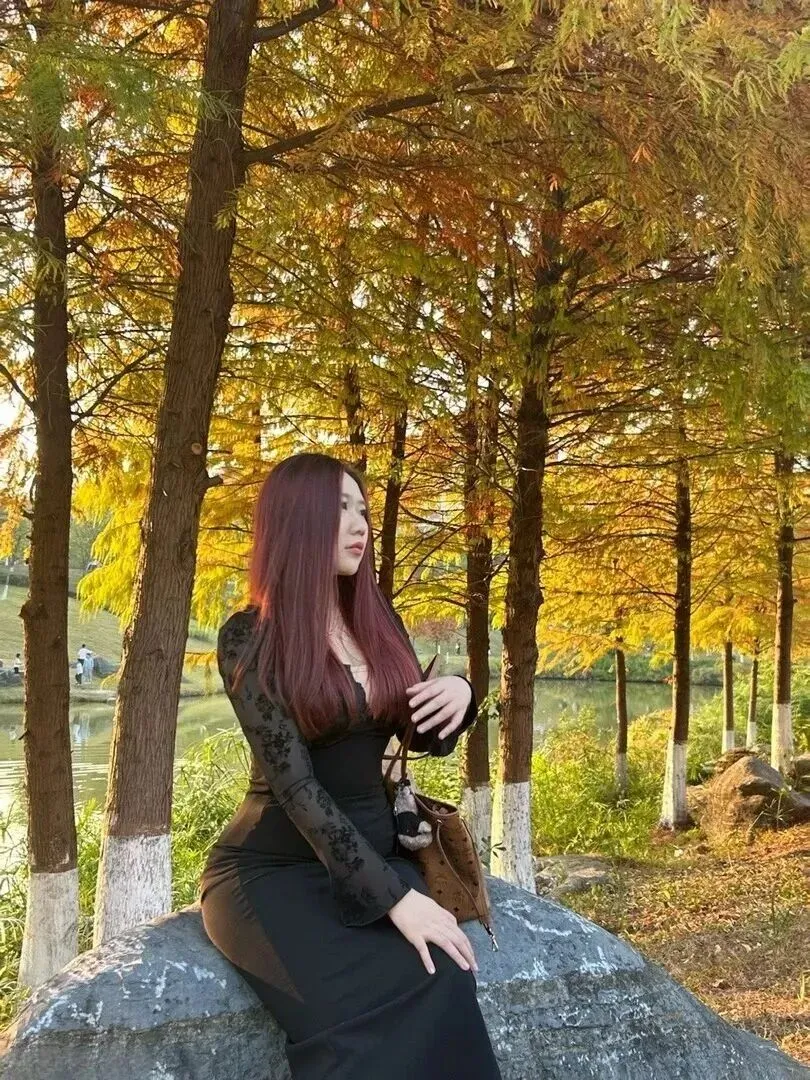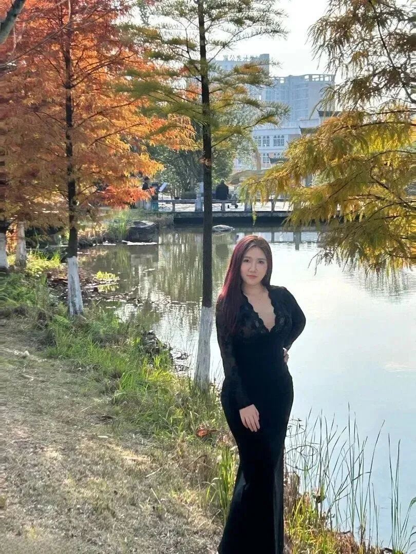 站在.湖边的栈.道上,黑.色裙子和.红叶背景.组成.经典的红.黑配色,.随便一.拍都像明.信片里的画.面。