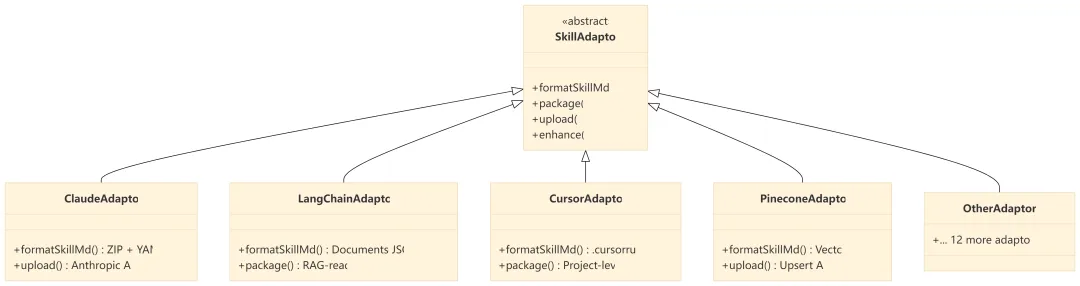 秘密在于经典的 策略模式(Strategy Pattern):所有平台共享同一个 SkillAdaptor 抽象基类,每个平台实现自己的格式化、打包、上传逻辑。