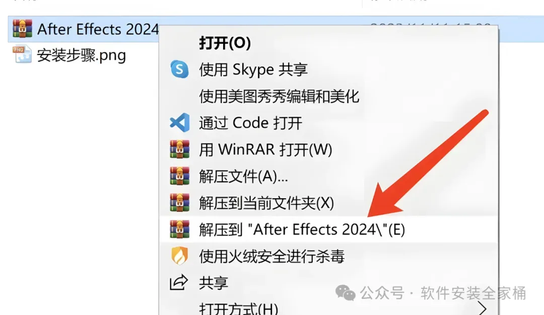 1.打开下载的AE2024软件安装包,鼠标右击压缩包选择【解压到AE2024】。