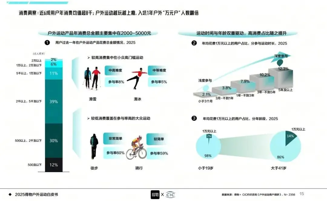 数据显示,得物App的Z世代95后用户渗透率达70%,平台80%的户外消费用户为Z世代群体。该群体在户外消费领域表现出较强的消费能力,近60%的用户年户外消费金额超8000元,参与户外运动1年以上的用户中,年消费超1万元的人数较以往实现翻倍;同时用户消费黏性较高,30%的用户会一次性购置同品牌整套户外装备,96%的用户明确表示未来将继续进行户外消费。