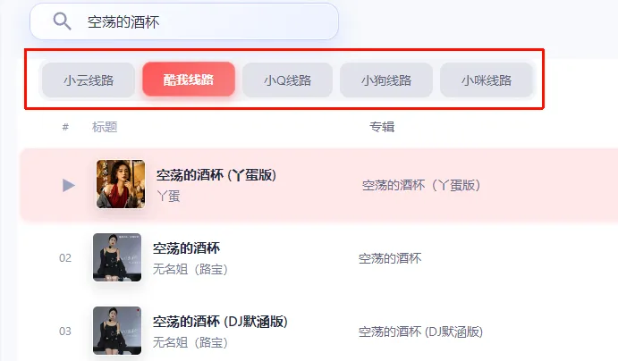 3.试听及下载:返回首页搜索想听的歌曲选中双击播放(若歌曲不能播放,切换其它线路即可)