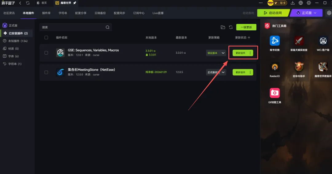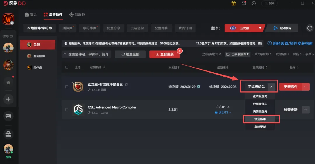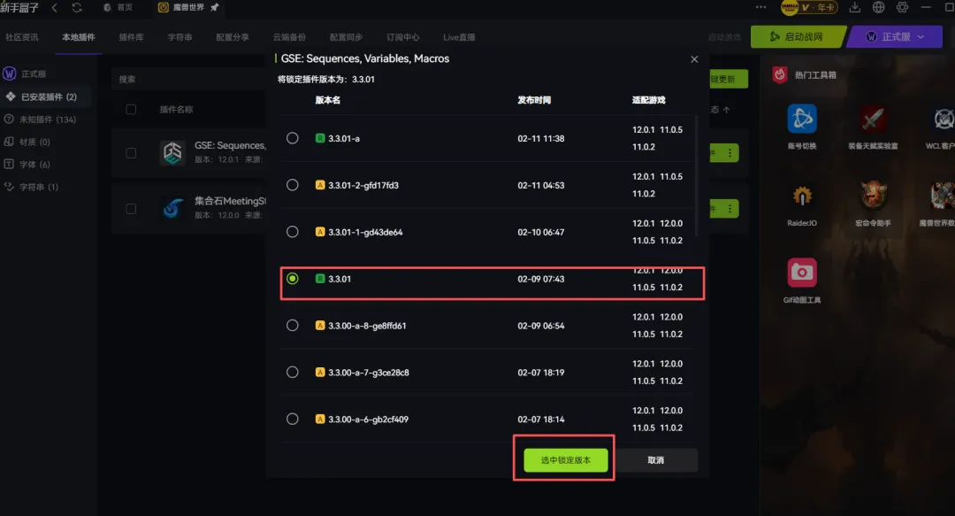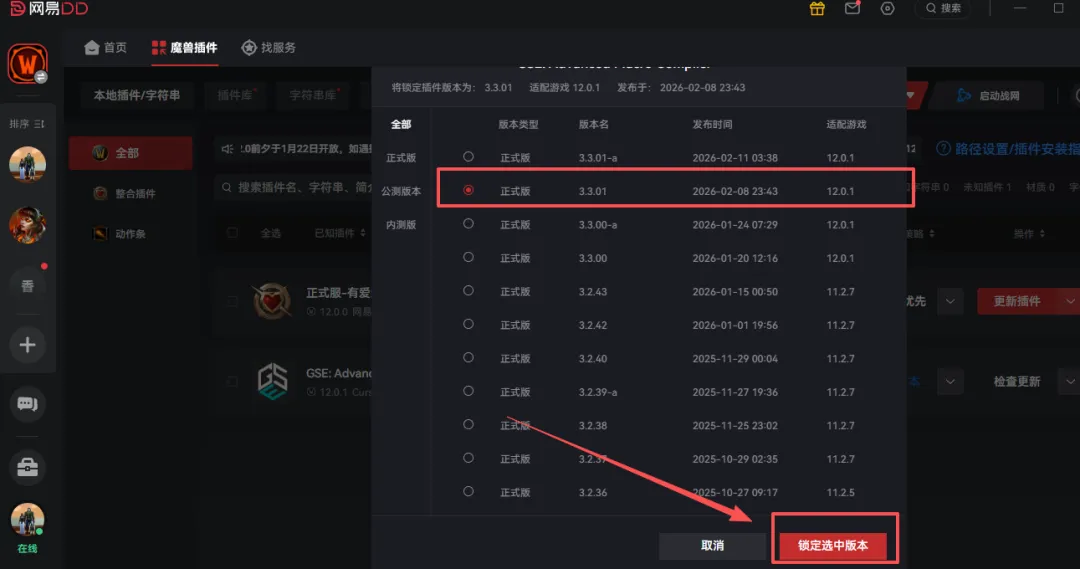 3️⃣锁定版本点开之后,选择版本3.3.01然后点锁定,关闭这个界面后点击更新就好了,更新好,返回游戏角色或者游戏内打字/rl重载就完成了!