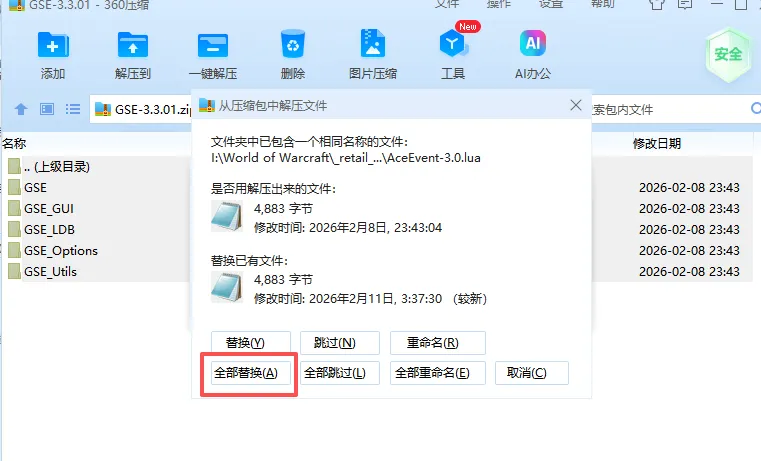 4️⃣如果你原来有下载GSE就会提示你是否替换全部,点是就可以了,点完进游戏,一样的返回游戏角色或者/RL刷新游戏界面!