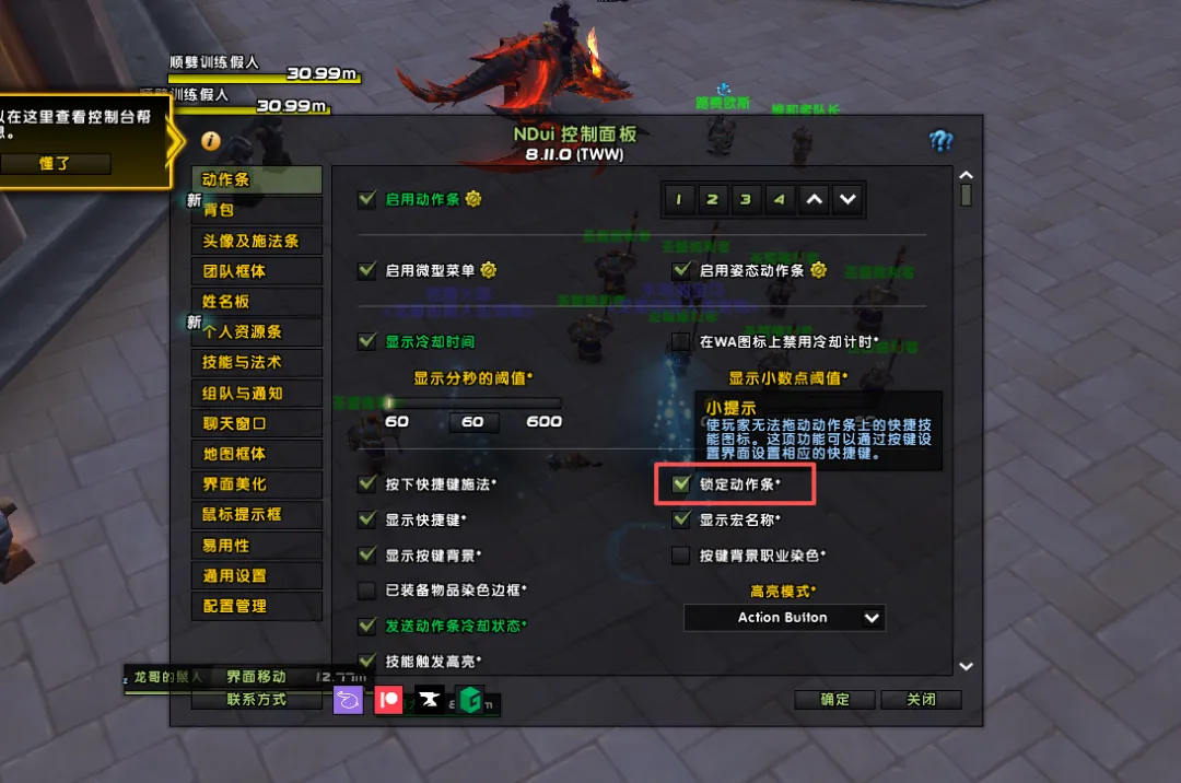 关于很多新朋友使用GSE无法绑定按键的问题,这里也简单阐述一下,大部分无法绑定按键问题都出在“露露整合插件”中整合了NDui,然而这个插件有个默认功能会锁定动作条,导致GSE无法绑定新的按键(特别是怀旧服出现这个问题特别多),你需要点开NDui的控制面板,把下图的锁定动作条取消掉,然后再继续绑定按键!
