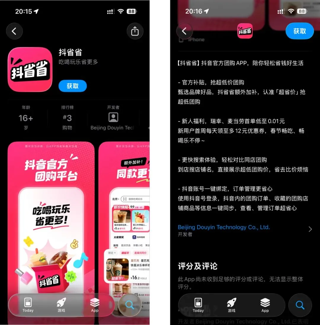抖音团购独立APP上线,首单 0.01 元 近日,抖音在本地生活战场又悄然上线一 APP“抖省省”官方团购平台。 当前已在各大应用商店上线。这意味着,抖音团购业务正式尝试从“内容流”中剥离,通过独立阵地构建新的交易闭环。 小助手整理以下核心要点解析: 极简设计:仅保留“首页”和“订单”入口,剥离社交内容干扰,聚焦交易效率。 补贴策略:首单0.01元、日领12元券等激进补贴,对标美团/大众点评价格体系,快速抢占用户心智。 业务焦虑:受近日“千问”免单活动冲击(首日净增5100万用户),需强化本地生活壁垒。 春节窗口:借消费旺季培养用户习惯,通过“到店搜店名直显低价”功能构建线下场景入口。 竞争格局:以近乎免费策略冲击美团基本盘,但长期需解决商家端佣金平衡问题。 用户迁移:需证明独立App相较抖音内嵌团购的体验优势,避免流量分流。 AI想象空间:若实现“智能比价+场景推荐”,或重塑本地生活服务链路。 最近在读: 完全免费,制作个人微信红包封面 腾讯元宝春节发放10亿现金 推荐10款免费好用AI视频工具 豆包P图实用指令 视频号这几类特定带货者,需要报备 2026全年营销节点活动规划 个人小程序免费搭建开发(Ai对话、官网类) 直播电商新规2月1日起施行!责任涉及平台、运营者、主播、MCN机构 关注小助手,了解更多电商实质内容哟~ 学以致用,随意一下点赞/分享/在看/留言