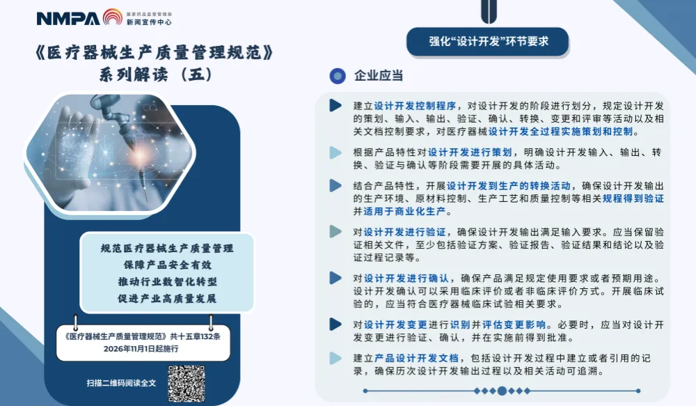 以上图片来源于国家药监局的系列解读五,聚焦于强化“设计开发”环节的要求。这是新版规范中非常关键的一环,旨在从源头上保障医疗器械的安全性、有效性与可追溯性。