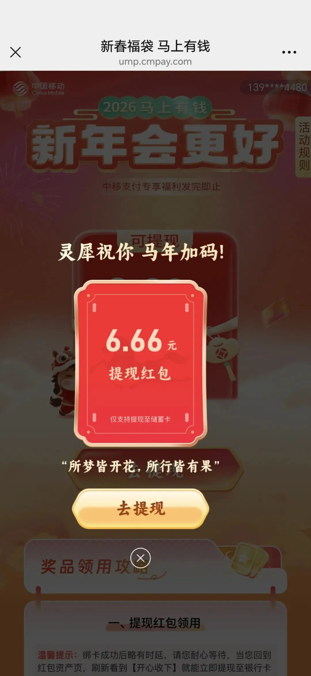 中国移动送福利,打开下方链接跳转移动APP,点击抽奖必中6.66元,如果APP没有绑定银行卡,需绑定银行卡提现,绑定过的直接提现