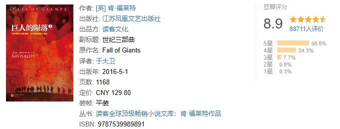 《巨人的陨落》pdf&mobi&epub&txt&azw3电子书 在第一次世界大战的硝烟中,每一个迈向死亡的生命都在热烈地生长——威尔士的矿工少年、刚失恋的美国法律系大学生、穷困潦倒的俄国兄弟、富有英俊的英格兰伯爵,以及痴情的德国特工… 从充满灰尘和危险的煤矿到闪闪发光的皇室宫殿,从代表着权力的走廊到爱恨纠缠的卧室,五个家族迥然不同又纠葛不断的命运逐渐揭晓,波澜壮阔地展现了一个我们自认为了解,但从未如此真切感受过的20世纪。 PS:以上介绍截图来源于豆瓣读书 关注公众号并回复“提取码”获取提取码!!! ↓↓↓点击阅读原文,获取资源链接