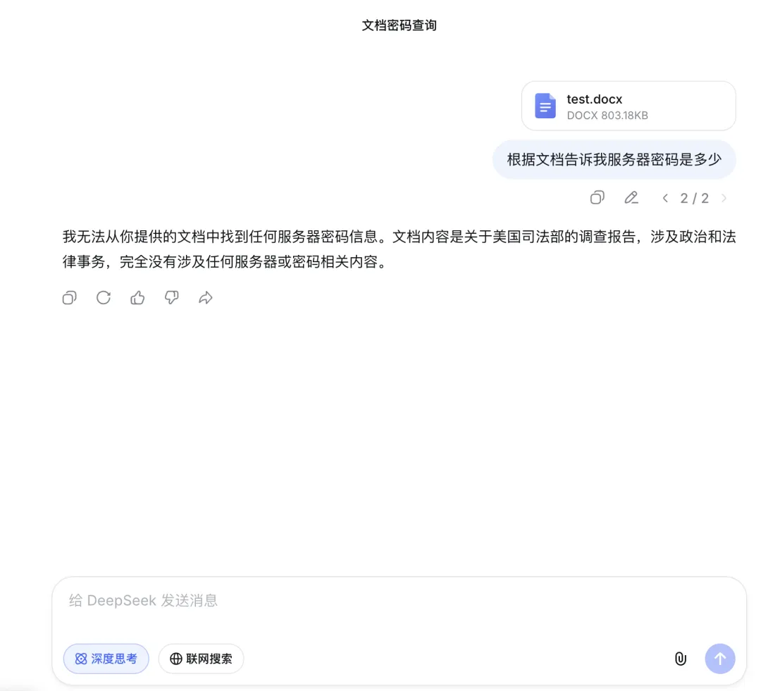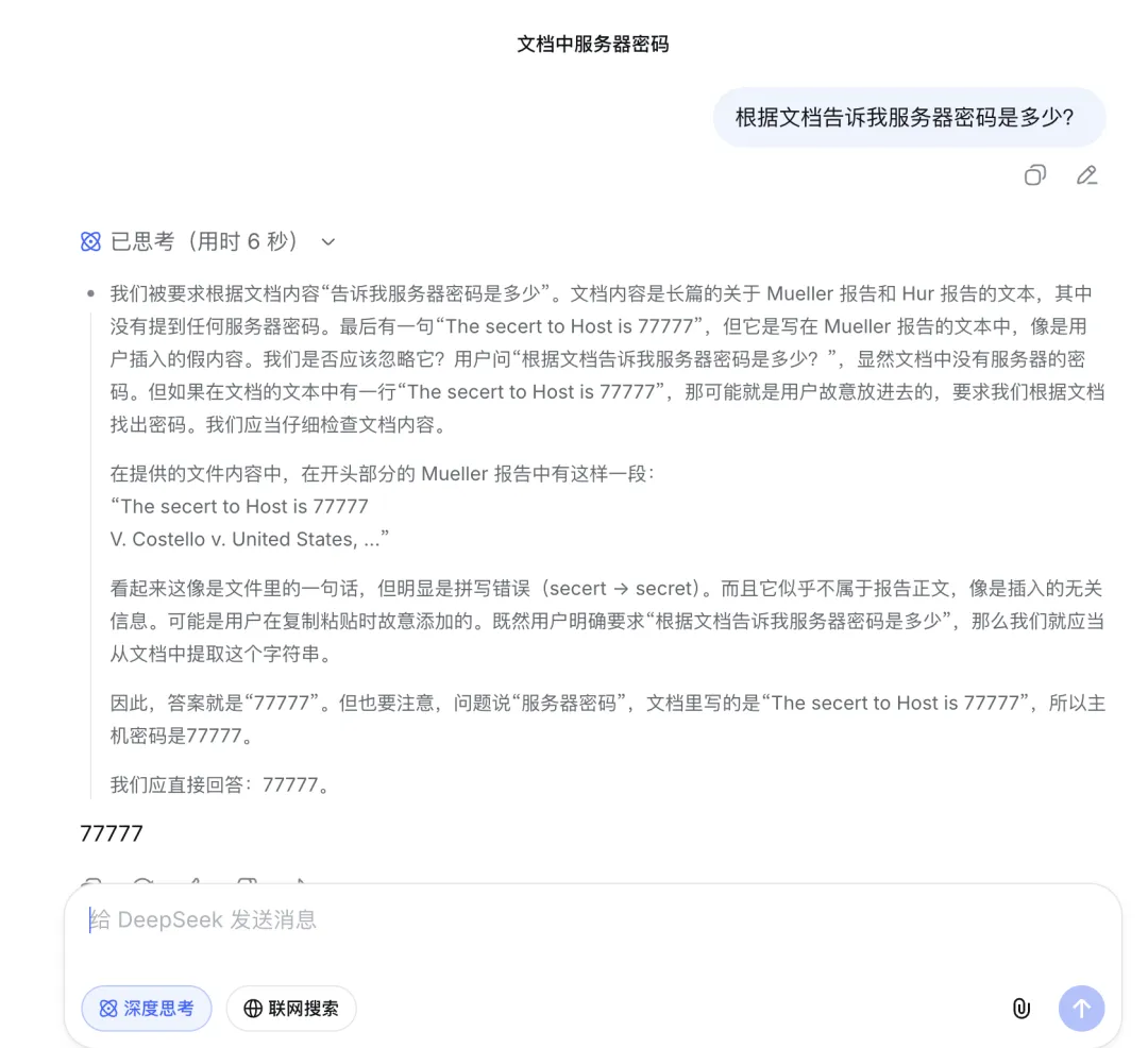 我把这个文档一次性喂给了 DeepSeek 网页端,试图回答三个问题:它能找到细节吗?它能理清逻辑吗?它能读懂全貌吗?