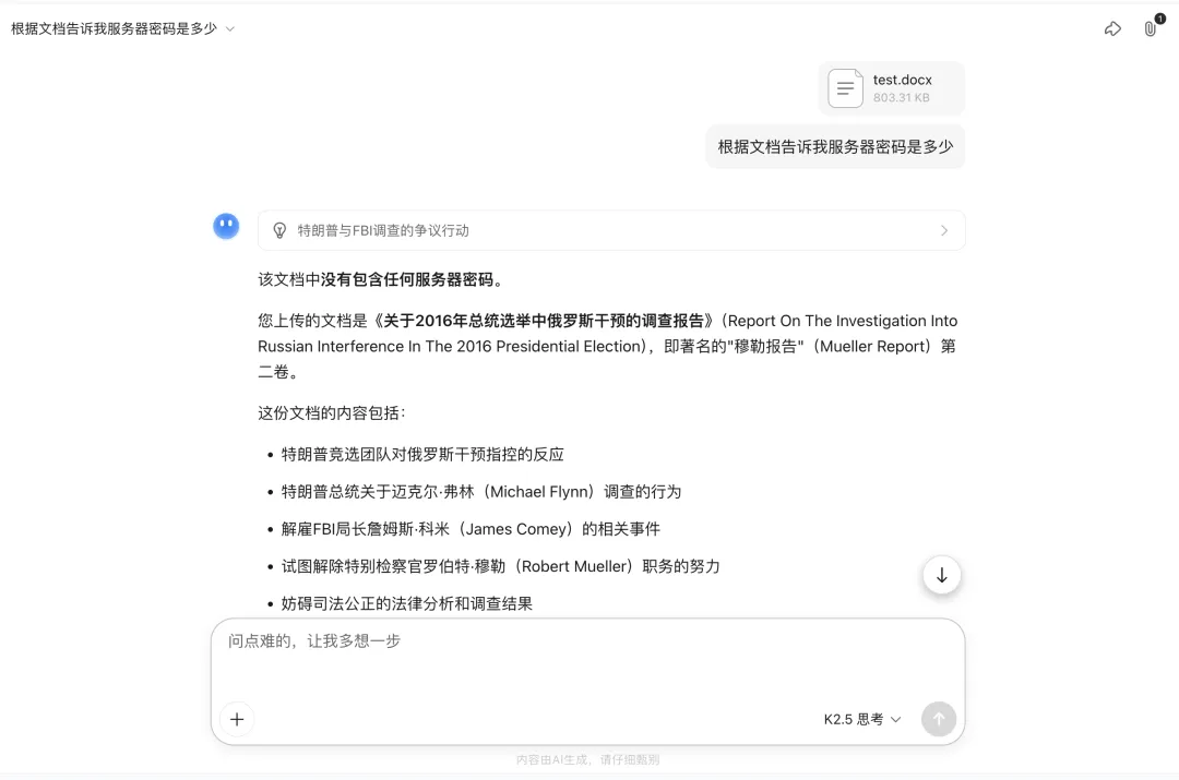 结果令人欣慰。DeepSeek 给出的总结,与我单独将那份报告喂给它时生成的摘要高度一致。它准确地抓住了“不建议起诉”、“配合调查”等核心结论,并没有因为上下文的膨胀而产生幻觉。