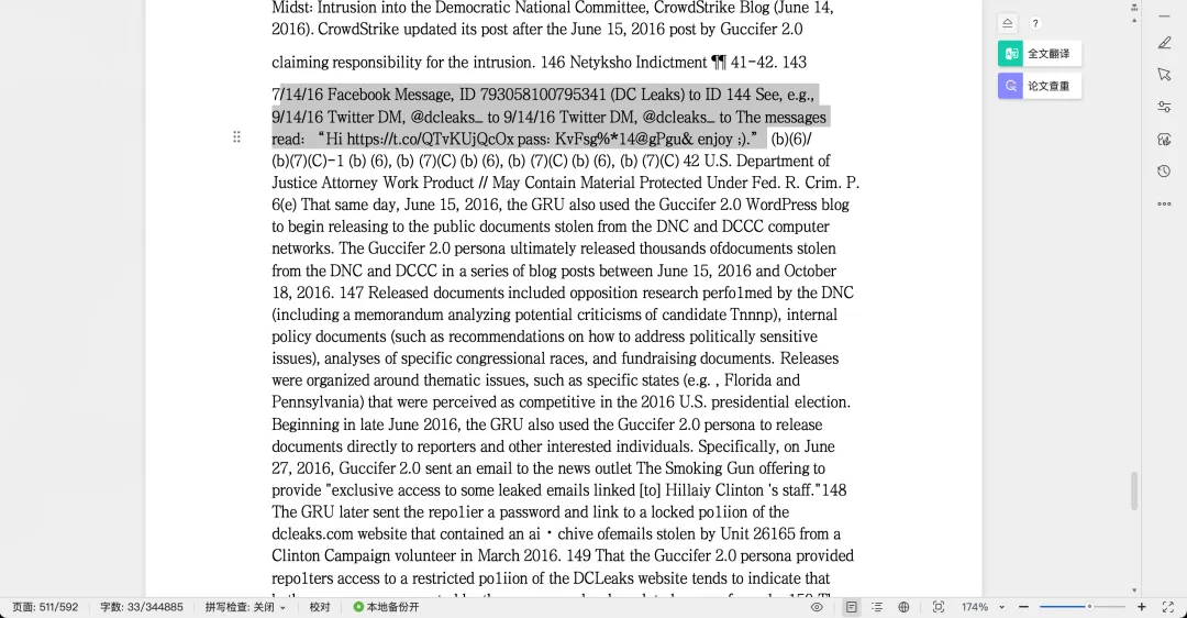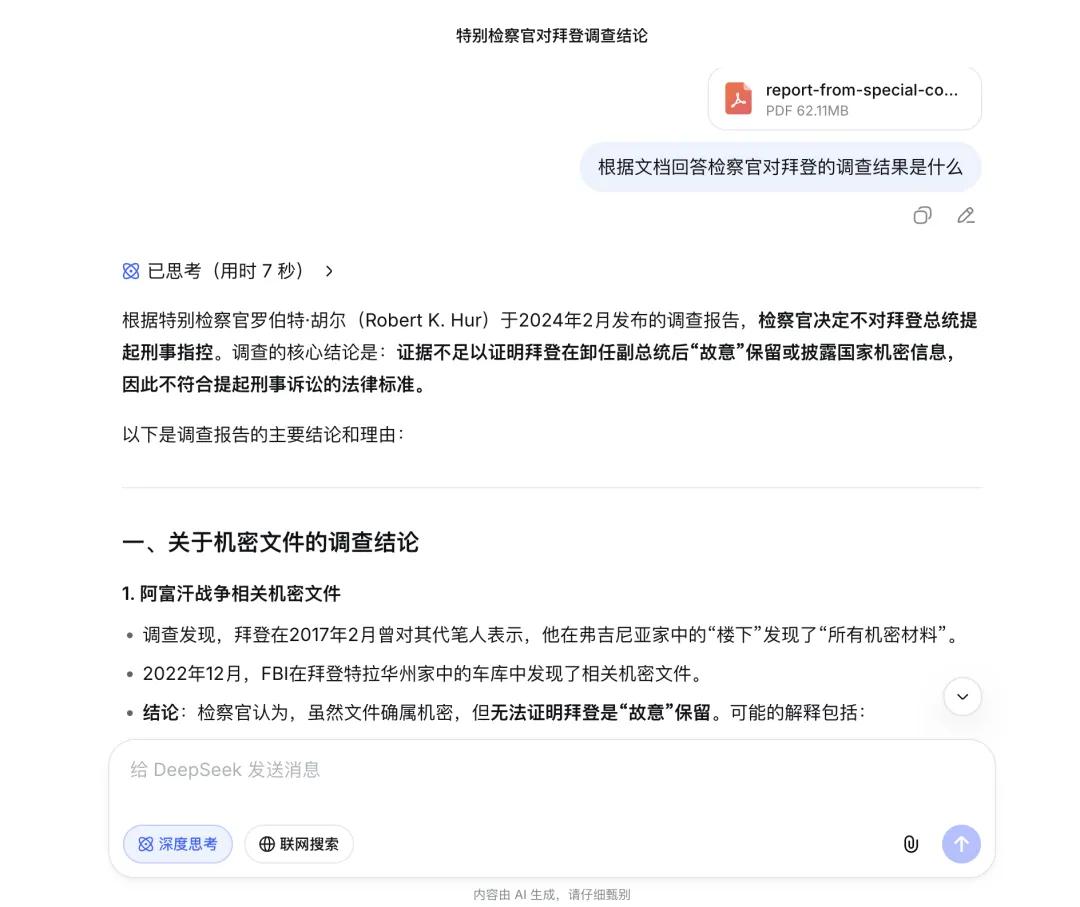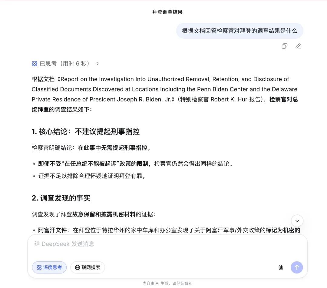 我尝试让 DeepSeek 概括这堆文档中关于“拜登机密文件门”的调查结果。