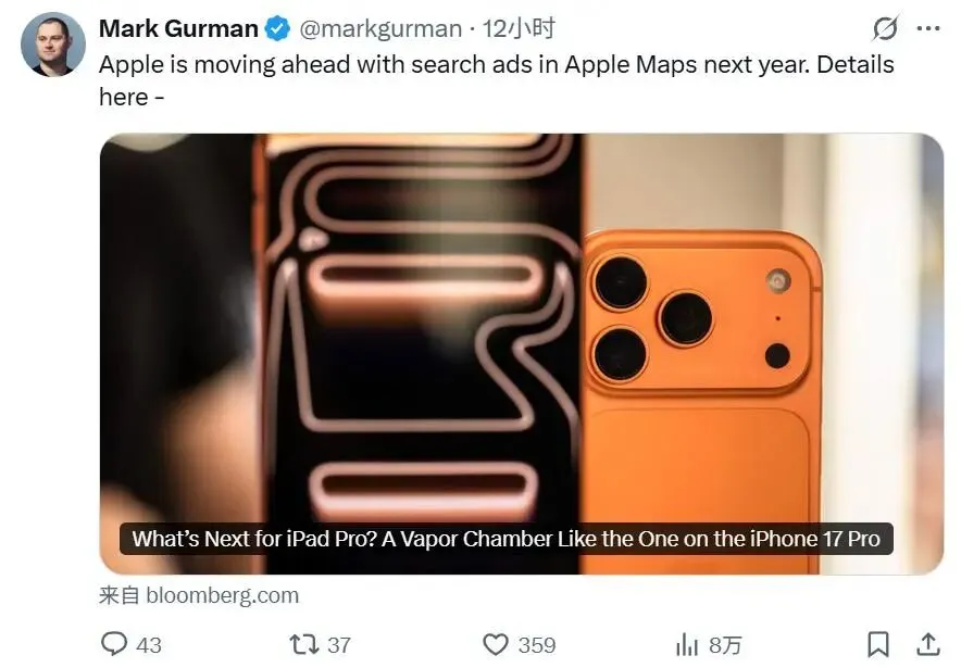 日前,彭博社记者,知名爆料人Mark Gurman在最新一期Power On通信文章中透露了,苹果对于在更多系统原生App中投放广告的相关计划。