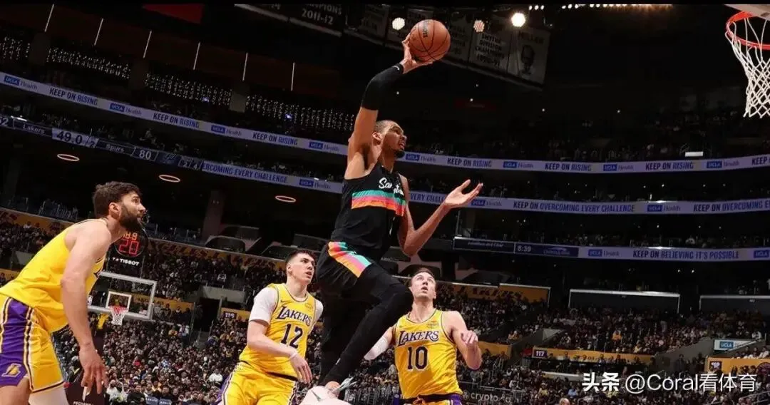 本场比赛,湖人战略性放弃,三巨头集体缺阵,最大排面是八村,马刺全主力出战,第一节双方大开大合,疯狂对攻,湖人拿下30分,但马刺在文班亚马的带领下攻势更加凶猛,文班亚马单节独得25分,马刺第一节赢了17分。第二节,哈伯和布莱恩特连连突破到内线得分,把分差拉开到23分,湖人暂停并不能阻止马刺继续扩大分差,文班亚马制霸篮下,布莱恩特三分神准,福克斯突投结合,马刺多点开花把分差越拉越大,半场结束已经领先29分。下场也无悬念,最终马刺136-108大胜湖人。