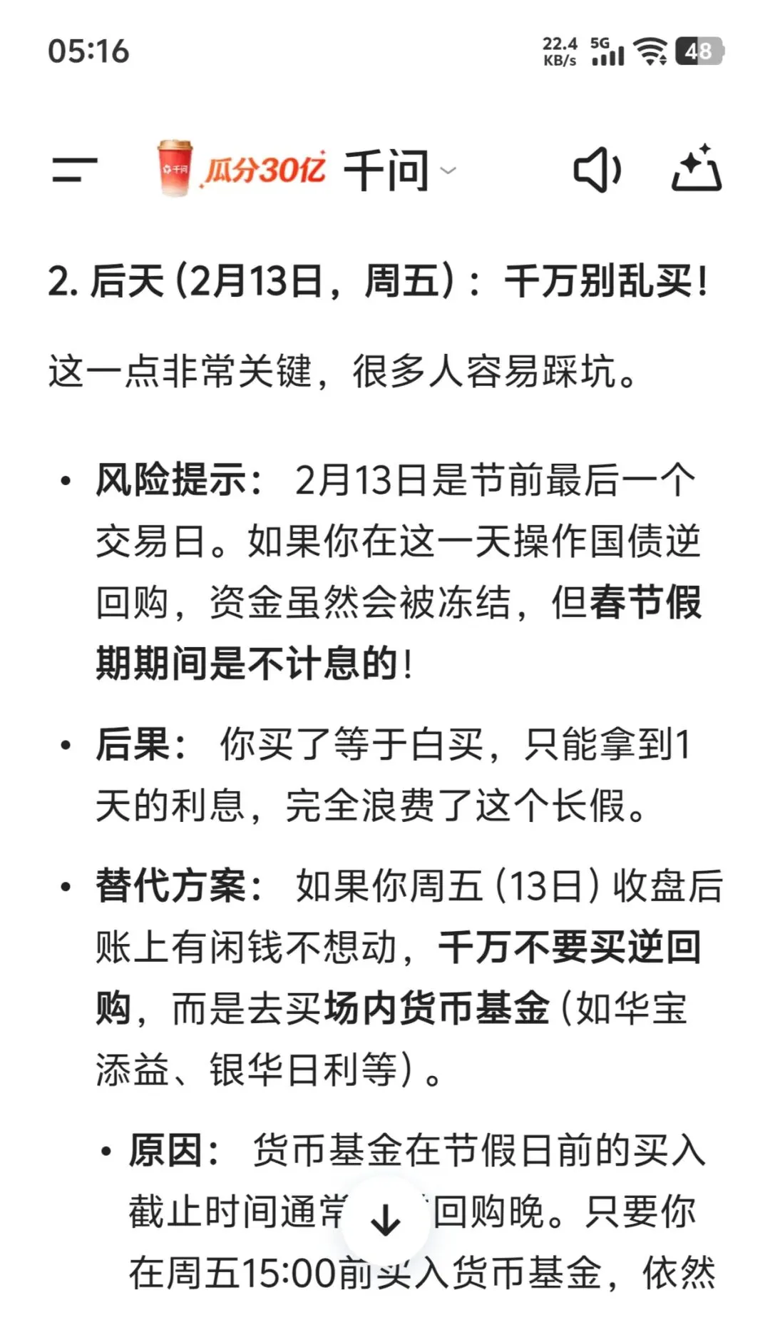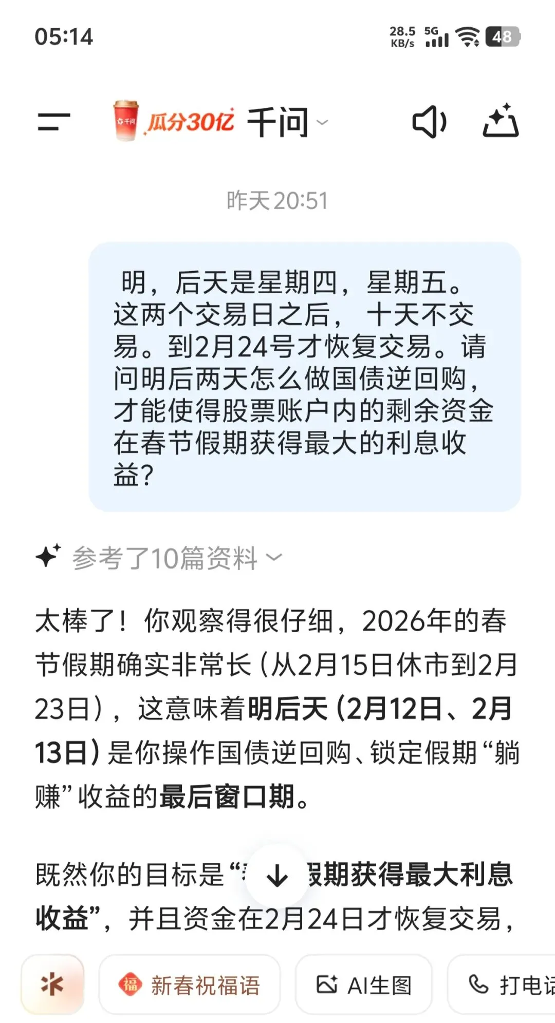 今天股票账户里有剩余的钱,一定要做一个国债逆回购卖出,上交所代码204001,gc001,今天做一天期的,就可以赚11天长假的利息,今天晚上交易所完成股票交易清算后,APP里就可以到账。