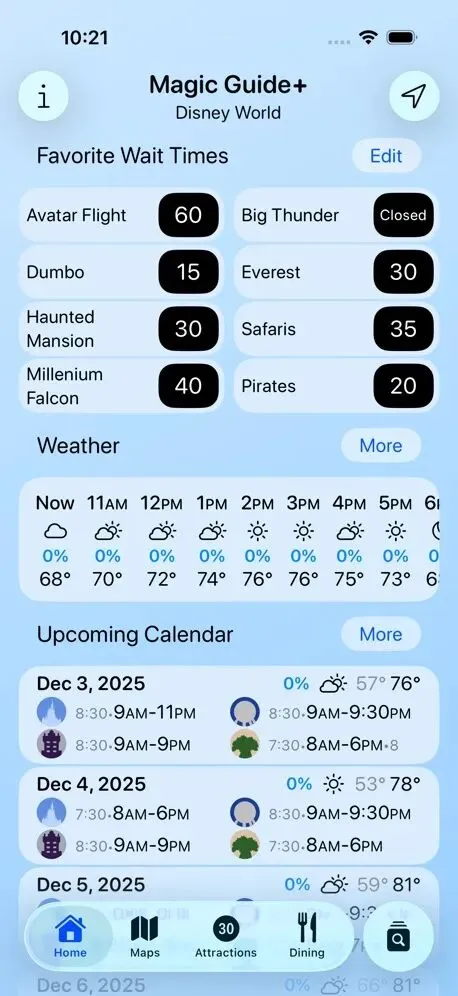 Magic Guide是一款迪士尼世界主题公园的移动应用,提供实时排队时间、互动地图导航和餐饮指南。应用包含所有迪士尼公园的高质量地图,支持GPS定位和搜索功能,帮助用户快速找到景点、餐厅等设施。餐饮指南涵盖300多个餐饮地点,提供菜单详情和折扣信息。用户可查看实时更新的排队时间,设置通知提醒,并贡献自己的等待时间报告。应用还提供公园运营时间、演出时间表和特别活动信息。高级功能包括跨菜单食物搜索、无广告体验和Apple Watch支持。