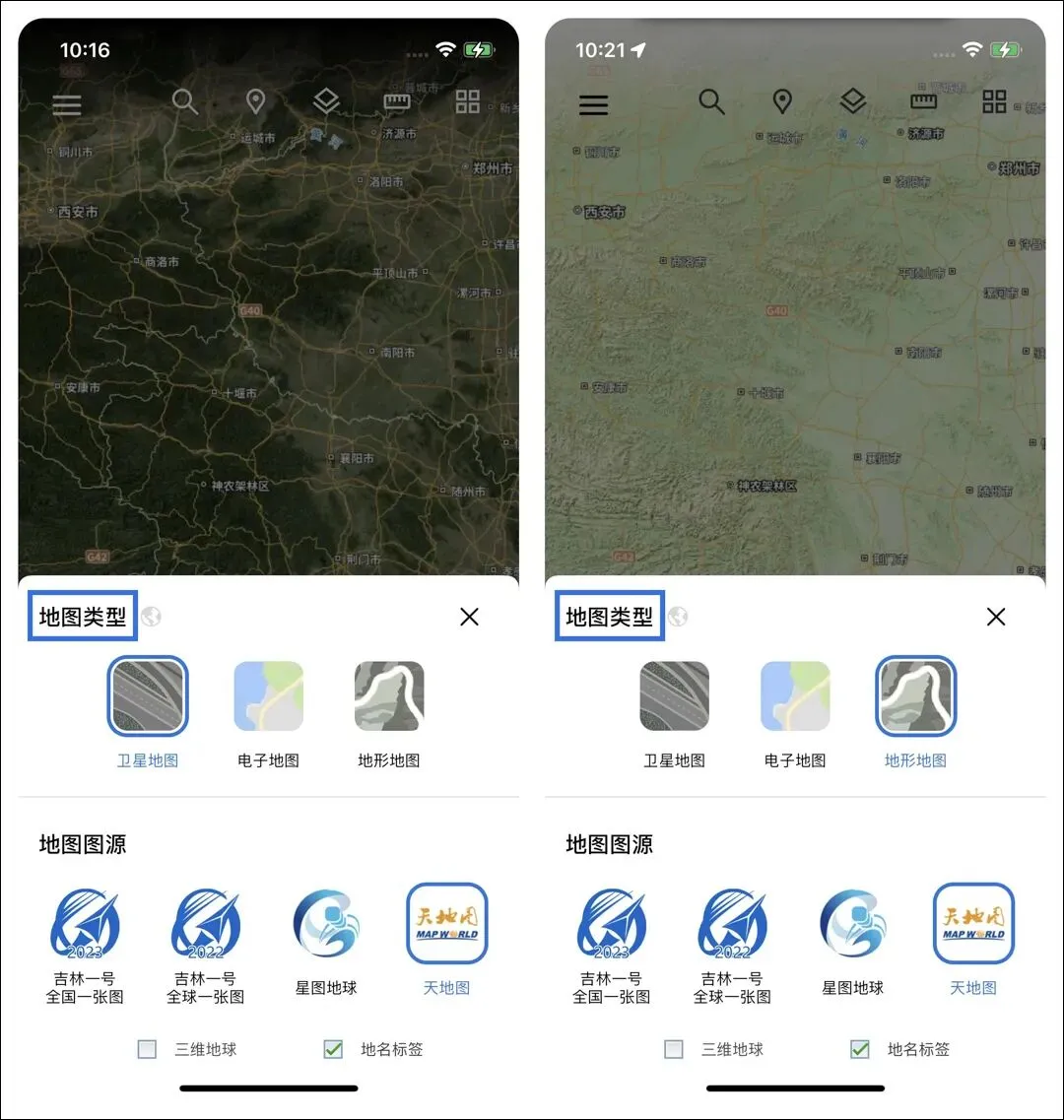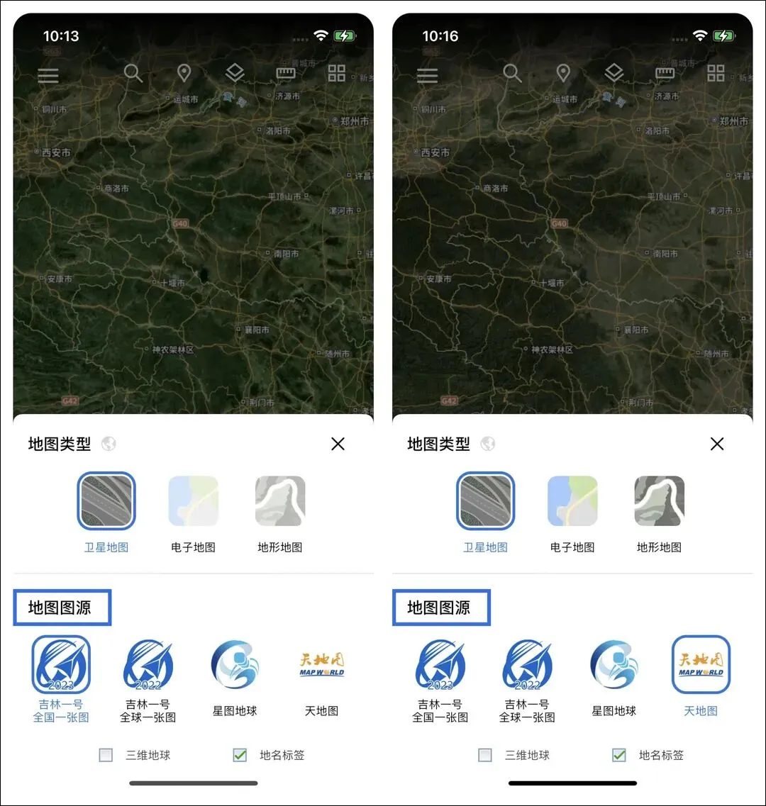 地名标签是叠加在卫星影像上的地名路网文本标签,通过勾选【地名标签】复选框来显示隐藏。