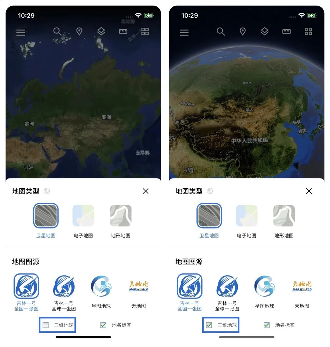 三维地球选项用来切换二三维地图显示,通过勾选【三维地球】复选框进行切换