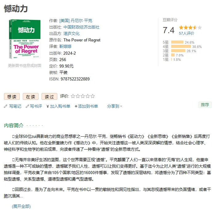 作者: [美国] 丹尼尔·平克出版社: 中国财政经济出版社出品方:湛庐文化原作名: The Power of Regret译者: 靳婷婷出版年: 2024-2ISBN: 9787522322889