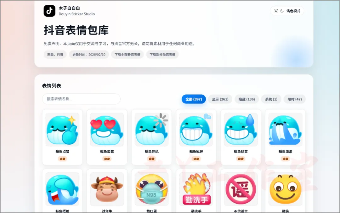 主打抖音表情包整理与展示,网站共收录 397 个表情,含显示、隐藏、系统及限时表情,支持上传 info.json 文件导入表情,提供静态、动态表情包下载功能。页面仅作学习交流,非抖音官方,内容丰富、分类清晰,方便用户查找和使用各类抖音热门表情。