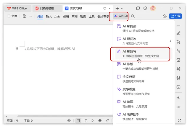 步骤1:打开WPS Office,新建一篇空白文字文档,单击选项卡最右侧的【WPS AI】按钮,在弹出的下拉菜单中选择【AI帮我写】命令,如图1所示,或者连续按下两次【Ctrl】键,唤起WPS AI。