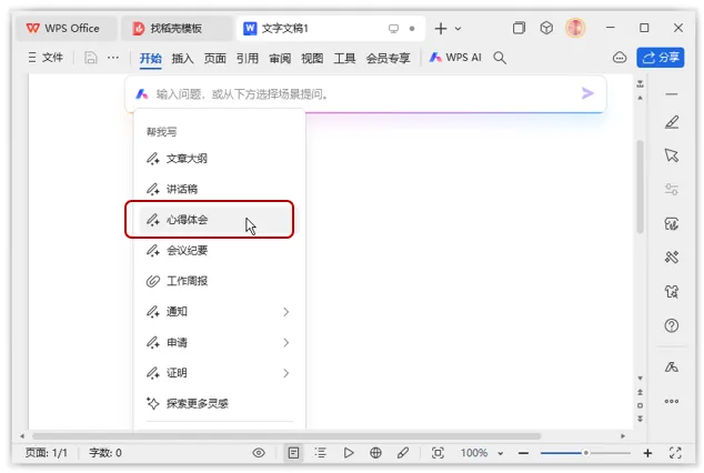 步骤2:显示出WPS AI对话框和下拉列表框,在下拉列表框中根据需要创作的内容选择对应的选项,这里选择【心得体会】选项,如图2所示。