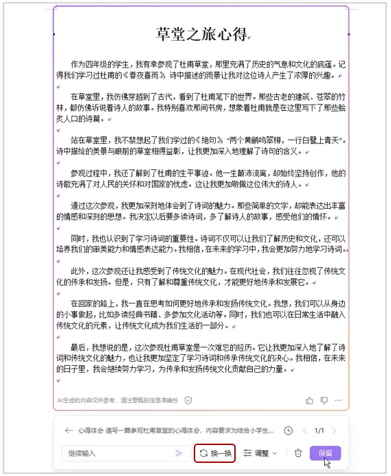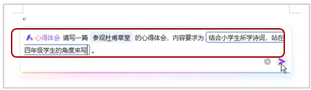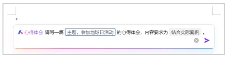 这种智能写作的能力,使得WPS AI成为了一个强大的写作助手,帮助用户提高工作效率,减少写作难度。例如,我们在参观某景点后想撰写一篇心得体会,可以写出需求,让WPS AI来起草内容,具体操作步骤如下。