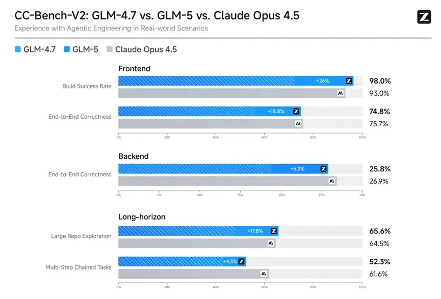 在多项核心测试中,GLM-5的表现都远超GLM-4.7: