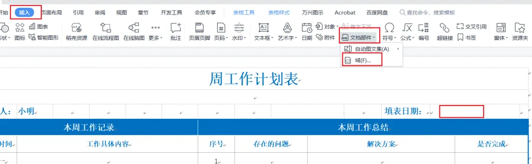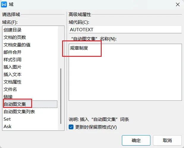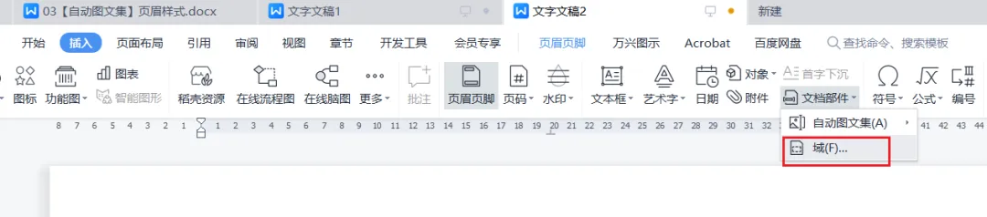 自动图文集属于域的一种,也可以通过域的方式插入
