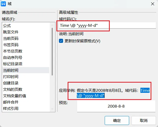插入获取当前时间的域代码