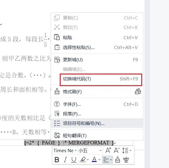 选中右侧的页码,然后右键,切换到域代码的编辑状态