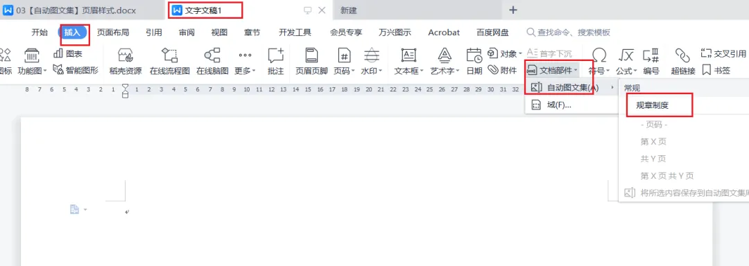 然后新建页面,单击页眉,然后在插入选项卡选择前面创建的图文集的名称