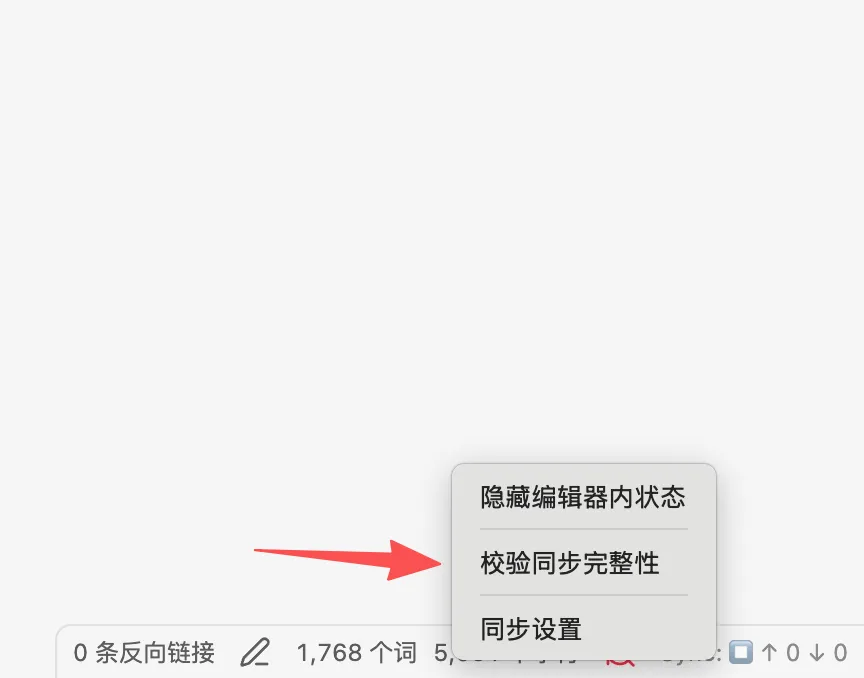 可通过命令面板输入”校验同步完整性”,或右键点击状态栏同步图标选择该功能: