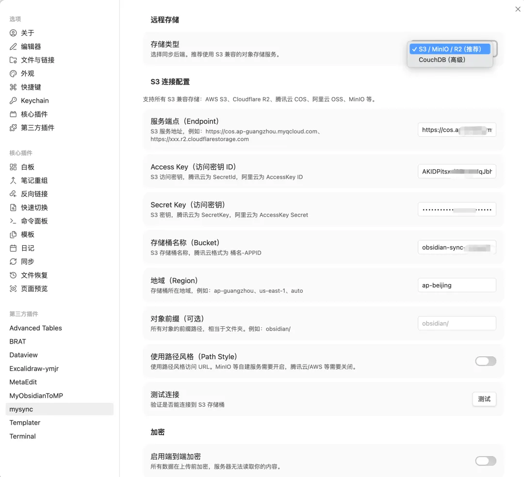 在 Obsidian 中打开 MySync 设置,选择”S3 / MinIO / R2″模式,填写:
