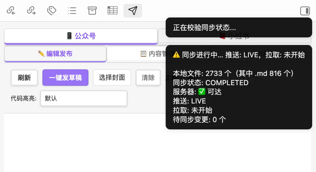 判断同步是否正常:同步状态显示 COMPLETED + 待推送 0 条 = 一切正常。