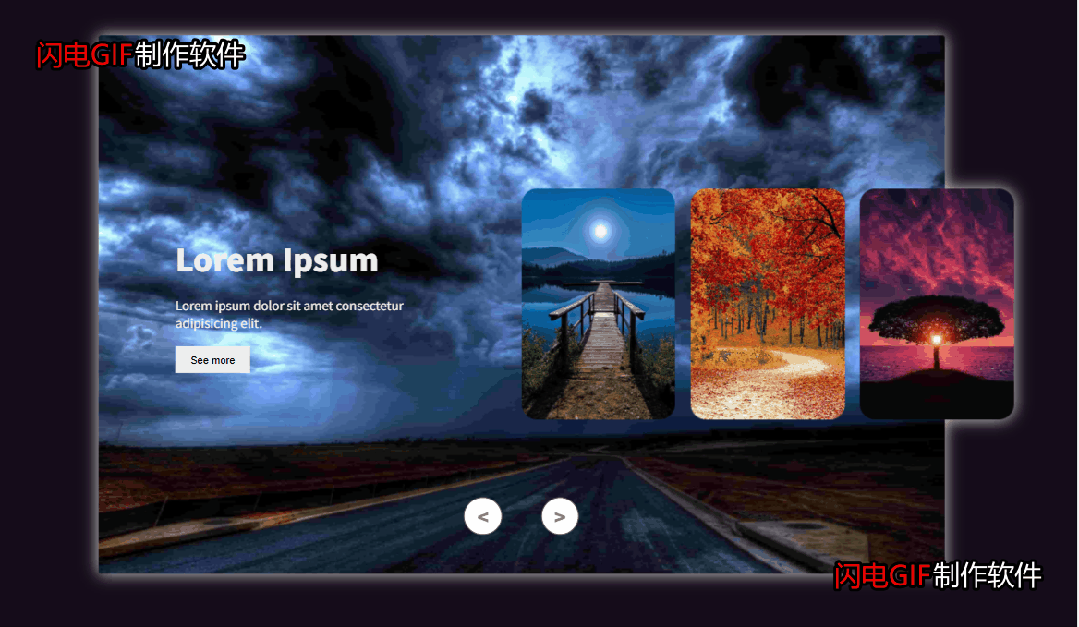 * {margin: 0;padding: 0;box-sizing: border-box;}:root {background-color: #150c1a;overflow: hidden;}.container {width: 1100px;height: 700px;position: absolute;top: 50%;left: 50%;transform: translate(-50%, -50%);padding: 50px;filter: drop-shadow(0 0 10px #dbdbdb);}.slide {/* 设置内容最大宽度 */width: max-content;display: flex;}.item {background-repeat: no-repeat;width: 200px;height: 300px;background-position: center;background-size: cover;position: absolute;top: 50%;/* 位移过渡导致动画卡顿 *//* transform: translateY(-50%); *//* 更换为 */margin-top: -150px;border-radius: 20px;transition: 0.5s;}.item:nth-child(1),.item:nth-child(2) {top: 0;left: 0;width: 100%;height: 100%;margin-top: 0;/* 覆盖上述y轴平移 *//* transform: translateY(0); */border-radius: 4px;box-shadow: none;}.item:nth-child(3) {left: 50%;}.item:nth-child(4) {left: calc(50% + 220px);}.item:nth-child(5) {left: calc(50% + 440px);}/* n为自然数 初值为0 依次+1递增 */.item:nth-child(n + 6) {opacity: 0;left: calc(50% + 660px);}.item .content {position: absolute;width: 300px;left: 100px;top: 50%;transform: translateY(-50%);color: #eee;display: none;}.item:nth-child(2) .content {display: block;}.item .name {font-size: 40px;font-weight: 900;opacity: 0;/* 动画名 执行时间 动画曲线 执行1次 保持最后执行的状态 */animation: show 1s ease-in-out 1 forwards;}.item .des {margin: 20px 0;opacity: 0;/* 动画名 执行时间 动画曲线 延时 执行1次 保持最后执行的状态 */animation: show 1s ease-in-out 0.3s 1 forwards;}.item button {padding: 10px 20px;border: none;opacity: 0;animation: show 1s ease-in-out 0.6s 1 forwards;}.btns {width: 100%;position: absolute;bottom: 50px;margin-left: -50px;display: flex;justify-content: center;}.s-btn {width: 50px;height: 50px;line-height: 50px;text-align: center;color: gray;background-color: #fff;font-size: 25px;border-radius: 50%;margin: 0 25px;cursor: pointer;font-weight: 900;border: 1px solid #555;transition: 0.5s;}.s-btn:hover {background-color: #ccc;}.item1 {background-image: url('./images/1.jpg');}.item2 {background-image: url('./images/2.jpg');}.item3 {background-image: url('./images/3.jpg');}.item4 {background-image: url('./images/4.jpg');}.item5 {background-image: url('./images/5.jpg');}.item6 {background-image: url('./images/6.jpg');}@keyframes show {from {opacity: 0;transform: translateY(100px);filter: blur(10px);}to {opacity: 1;transform: translateY(0);filter: blur(0);}}