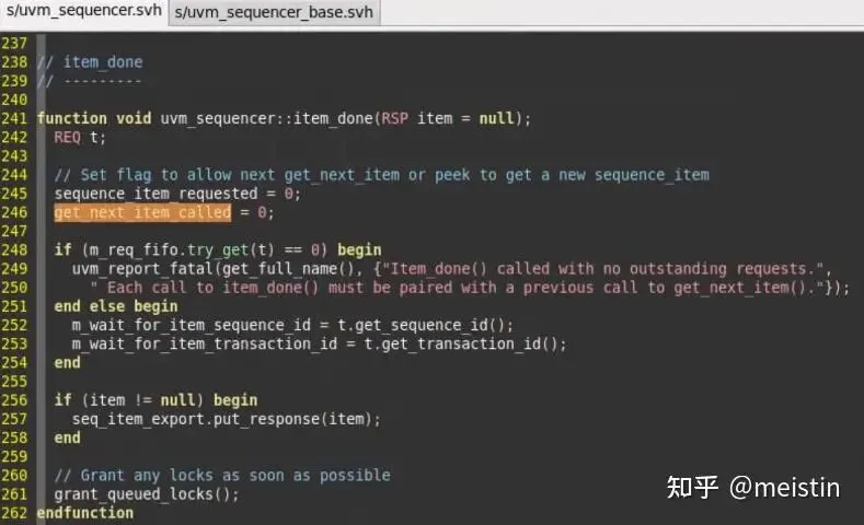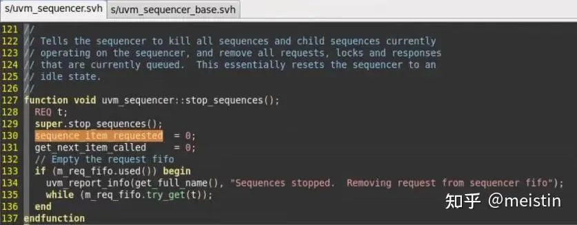 由此我们知道get_next_item()一定要对应一个item_done(),否则就会报错。有种情况可以在get_next_item()后没有item_done(),那就是主动调用stop_sequences()函数(会清空sequencer上所有的待发送内容以及相关标志位,类似于一个对sequencer的reset操作)