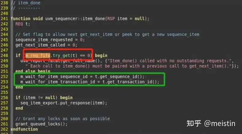 通过以上的源代码分析我们就知道,同一时刻某个sequencer只会被一个sequence所占用,并且发送的包在send_request到item_done之间会暂存在在一个uvm_tlm_fifo中,数据在get_next_item的时候并不会从fifo中pop出来,而是用的peek函数,只有等到item_done的时候才用try_get将fifo对应的数据清除掉了,如下图所示: