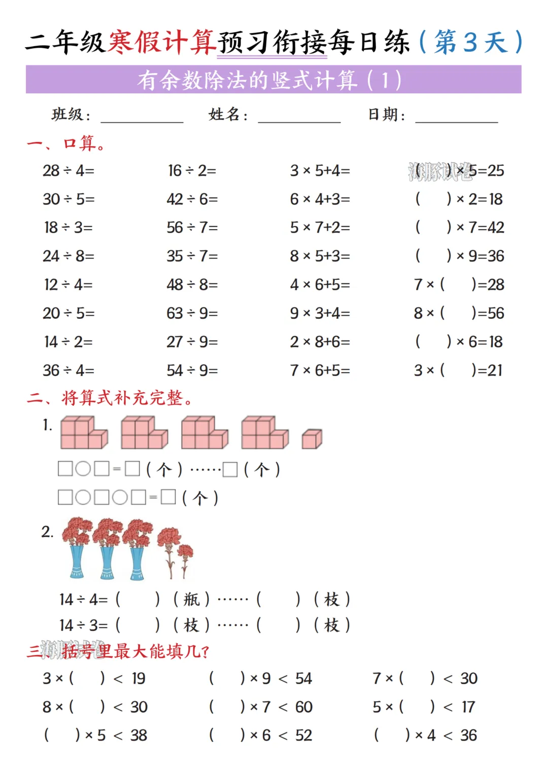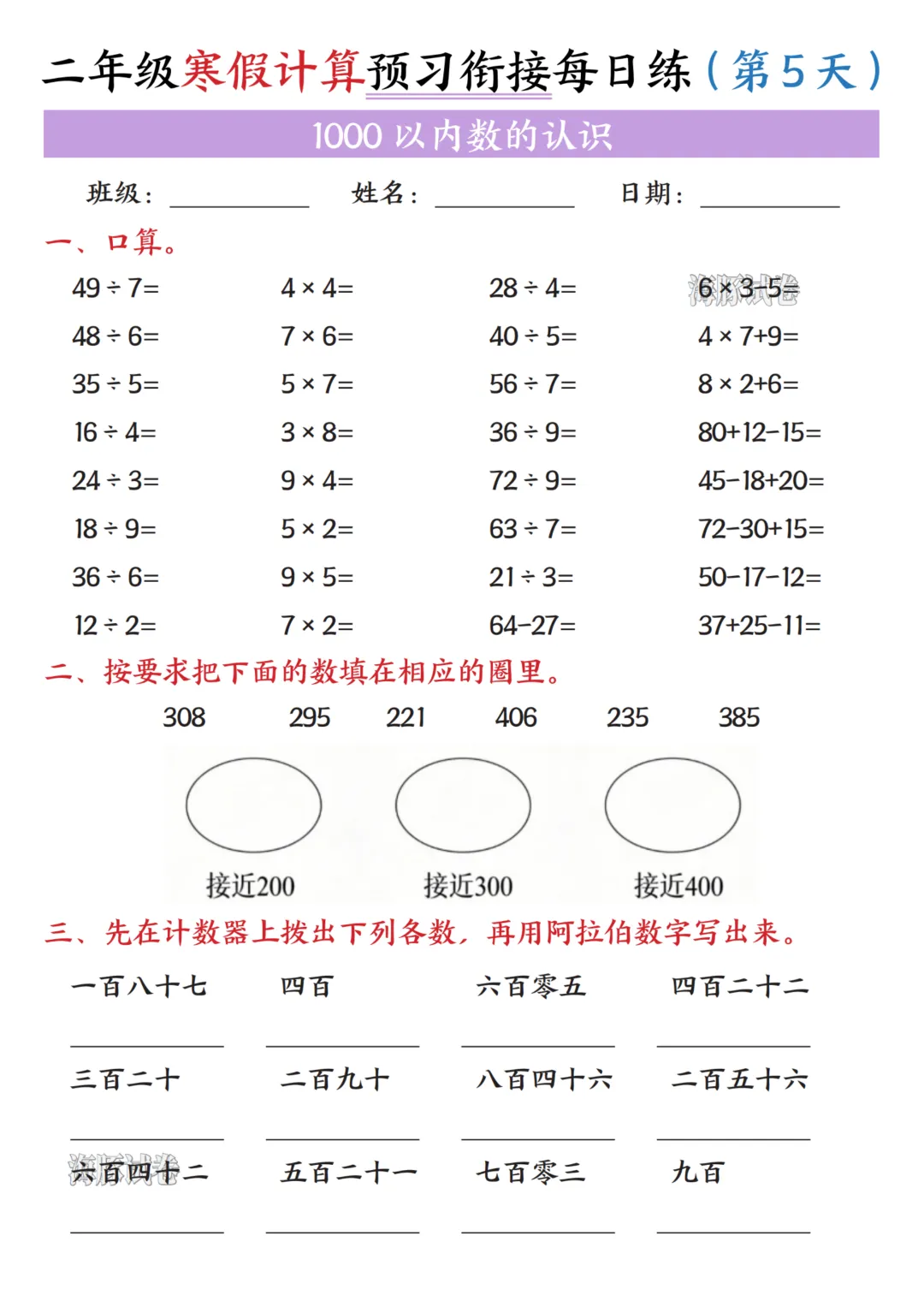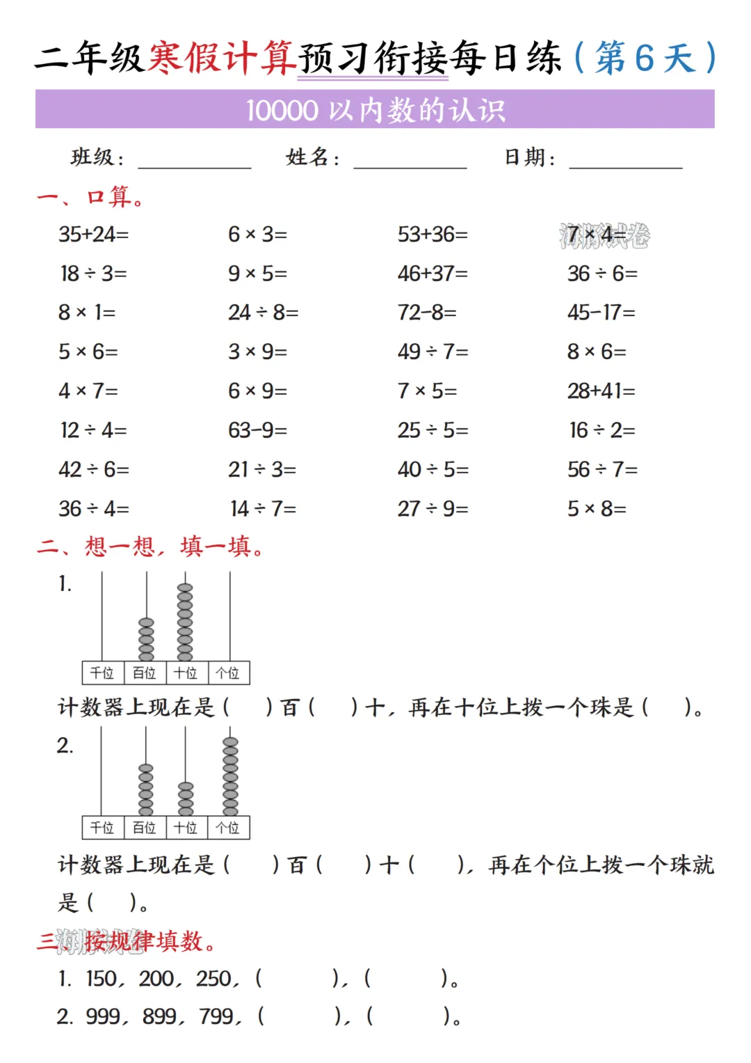 二年级数学寒假计算预习衔接每日练,PDF电子版,共15页可下载打印