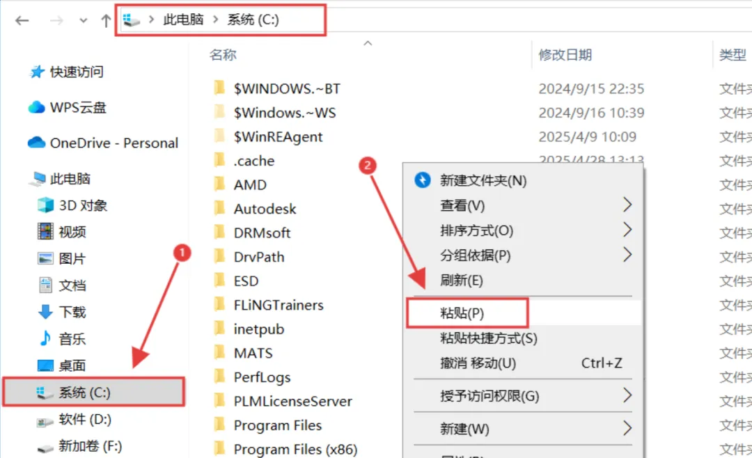 12.打开电脑C盘根目录,鼠标移动在空白处,右键把刚复制的文件夹【粘贴】到此处。