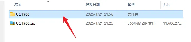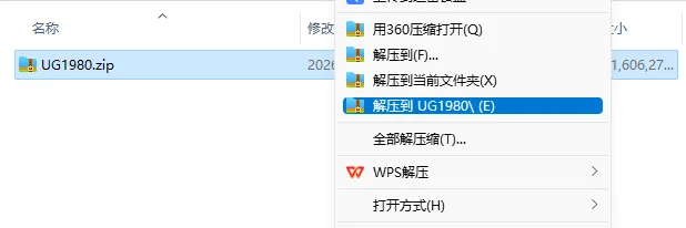 1.解压安装包:鼠标右击【UG1980】压缩包,选择电脑上安装的解压软件,点击【解压到UG1980】。