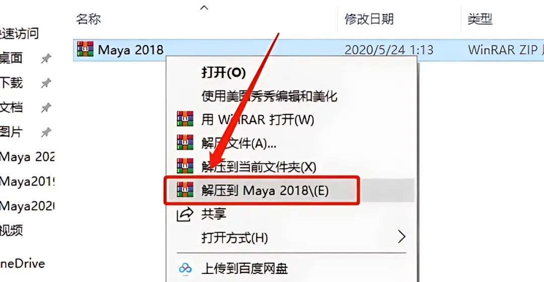 1.打开下载好的软件安装包,鼠标右击压缩包选择【解压到Maya 2018】