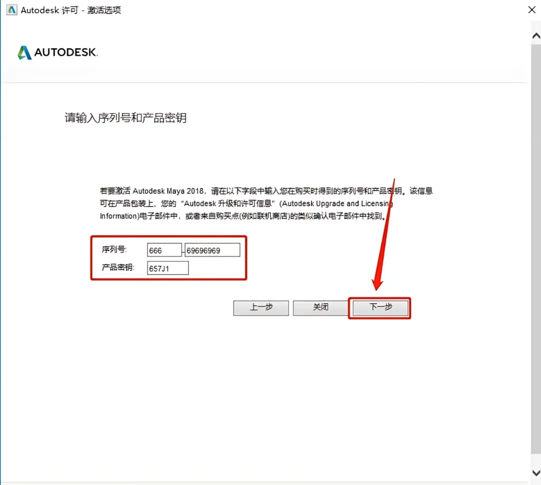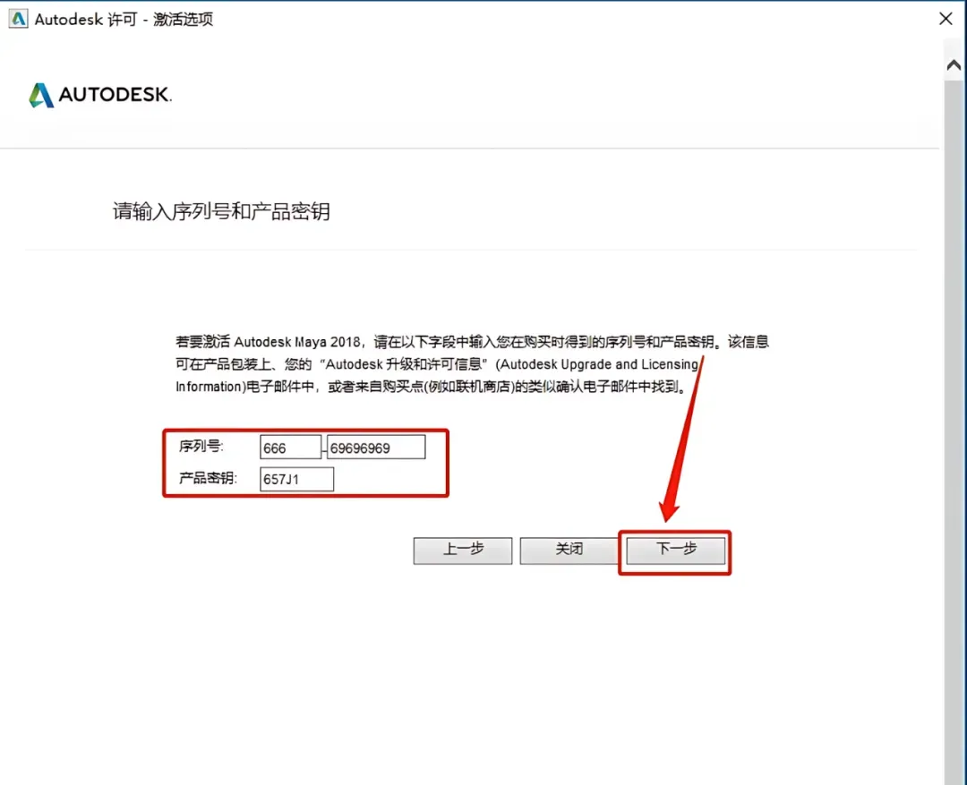 9.输入序列号:666-69696969,667-98989898,400-45454545,066-66666666,产品密钥:657J1,输入好后点击【下一步】